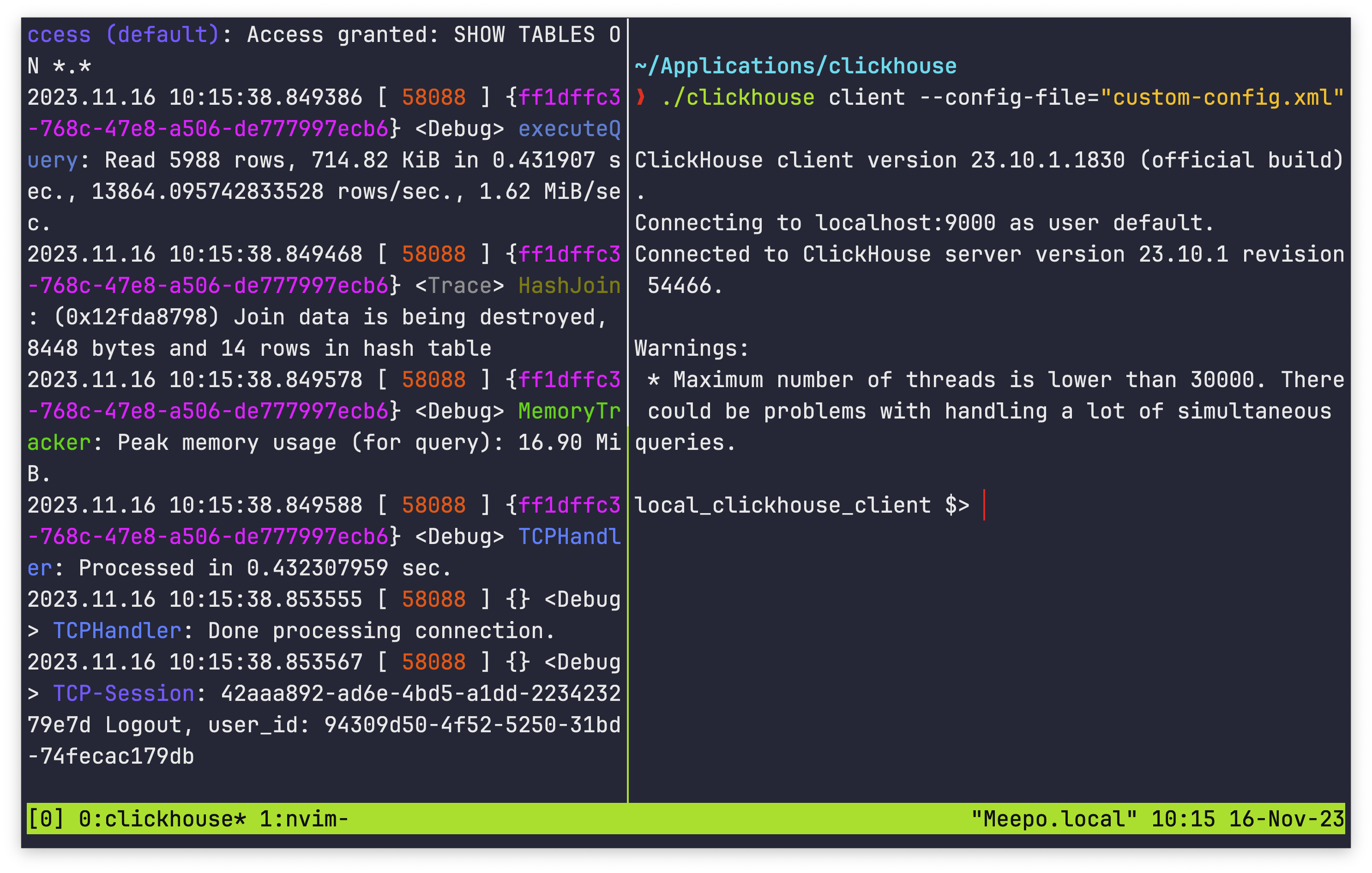 ./clickhouse serverIn a new terminal window, start the Clickhouse client with the